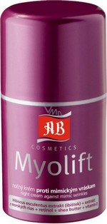 Účinky: Přípravky řady AB Myolift zamezují tvorbě vrásek především mimických, které vznikají v důsledku dvou faktorů – opakovaným stahováním svalů způsobených přirozenou mimikou tváře a v důsledku biologického stárnutí (stárnutí buněk, oxidační stárnutí vlivem volných radikálů..)