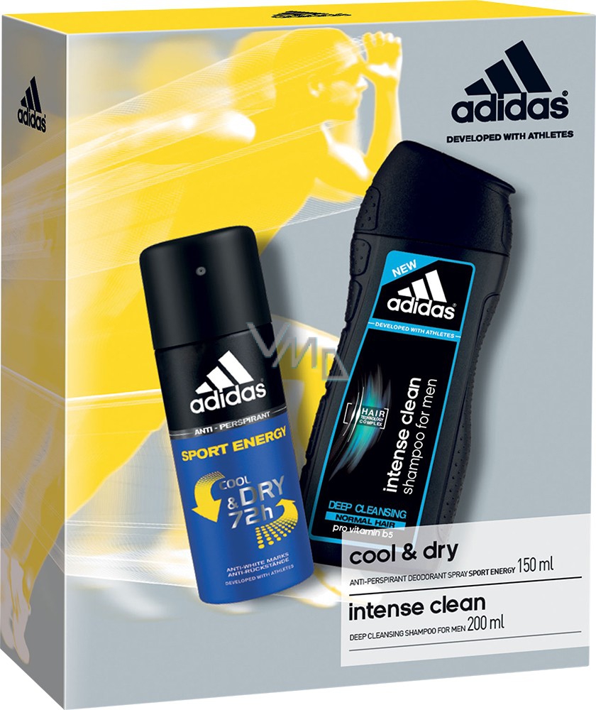 Adidas Cool & Dry 72h Sport Energy antiperspirant deodorant sprej pro muže 150 ml + Intense Clean sprchový gel a šampon pro normální vlasy pro muže 200 ml, kosmetická sada