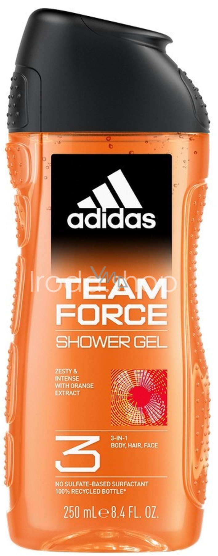 Żel pod prysznic Adidas Team Force zawiera naturalny olejek z pomarańczy i paczuli. Skład został przebadany dermatologicznie i jest wegański. Opakowanie wykonane jest z 100% materiałów z recyklingu. Żel pod prysznic przeznaczony jest do ciała, włosów i twarzy. Doskonale sprawdzi się podczas codziennej higieny oraz po aktywnościach sportowych.