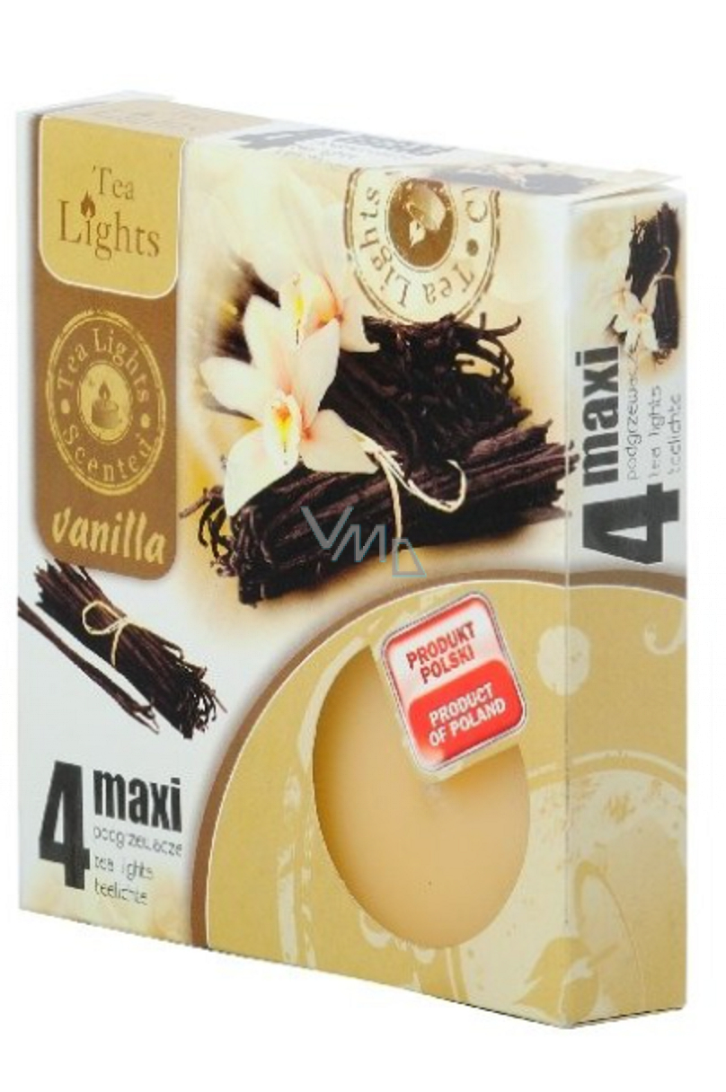 Maxi vonné čajové svíčky v kalíšku s vůní vanilky. Vychutnejte si romantickou a relaxační chvilku s elegantními svíčkami s vůní.