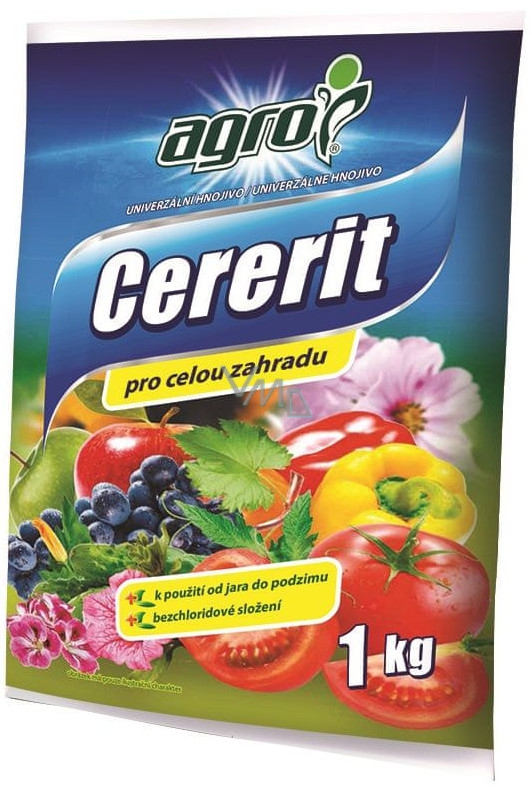 Agro Cererit je univerzální granulované bezchloridové hnojivo s obsahem Hořčíku, který zajišťuje vyšší úrodu a lepší vybarvení plodů. Je vhodné pro všechny druhy rostlin, zejména pro rostliny citlivé na chlór (plodová zelenina, květiny). Je ideální k základnímu hnojení a přihnojování během vegetace.