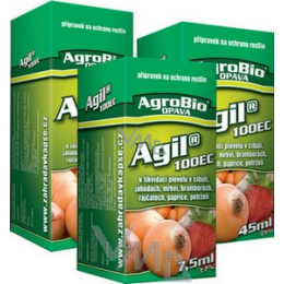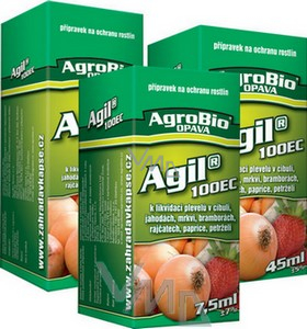 Agil 100 EC selektivní postřikový herbicid ve formě emulgovatelného Koncentrátu určený k postemergentnímu hubení jednoděložných jednoletých a vytrvalých plevelů, v cukrovce, bramborách, lnu, hrachu, řepce ozimé i jarní, jeteli, vojtěšce, sóji, Jahodníku, rajčatech, cibuki, zelí, paprice, mrkvi, slunečnici, bobu, pelušce, Kmínu, svazence, hořčici, Máku, sadech, lesních kulturách a lesních školkách. Pro ryby a ostatní vodní organismy je přípravek jedovatý. Riziko vyplývající z použití přípravku je při dodržení návodu na použití a správné aplikaci pro Včely přijatelné. Přípravek není hořlavý. Zabraňte kontaminaci vody přípravkem nebo jeho obalem. Nečištěte aplikační zařízení v blízkosti povrchové vody. Zabraňte kontaminaci vod splachem z farem a z cest.