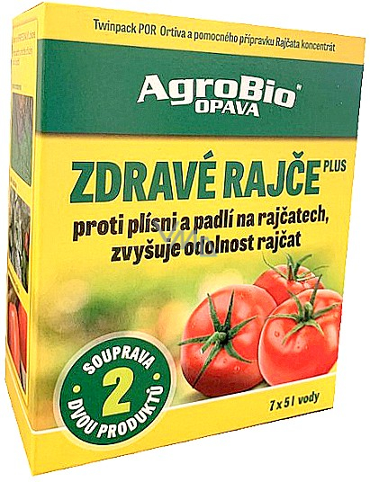 Souprava dvou přípravků (Ortiva a Rajčata koncentrát) pro ošetření rajčat proti plísní a dalším houbovým chorobám a pro zvýšení obranyschopnosti rajčat během růstu a sklizně.