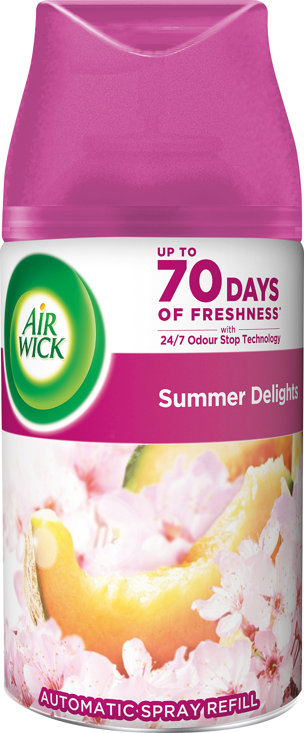 Wzmocnij zapach historii swojego domu z automatycznym sprayem od Air Wick Life Scents Freshmatic Radosne lato. Przynieś radość lata do swojego domu z tym zabawnym i wesołym zapachem łączącym świeże białe kwiaty, cukrowego arbuza i delikatną wanilię.