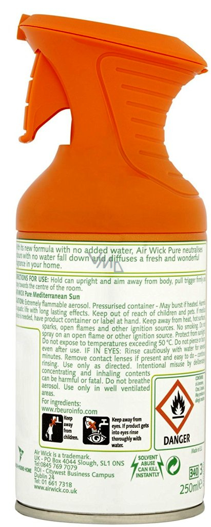 Nebezpečí. Extrémně hořlavý aerosol. Nádobka je pod tlakem. Nevystavujte slunečnímu záření a teplotám nad 50°C. Ani vyprázdněnou nádobku neprorážejte a nevhazujte do ohně. Nestříkejte do otevřeného ohně nebo na žhavé předměty. Uchovávejte mimo dosah zdrojů zapálení - Zákaz kouření. Uchovávejte mimo dosah dětí. Nevstřikovat do očí. Před použitím dobře protřepejte. Při zasažení očí: Několik minut opatrně vyplachujte vodou. Vyjměte kontaktní čočky, jsou-li nasazeny a pokud je lze vyjmout snadno. Pokračujte ve vyplachování. Je-li nutná lékařská pomoc, mějte po ruce obal nebo štítek výrobku. Používejte pouze k určenému účelu. Nevdechujte aerosoly. Používejte pouze v dobře větraných prostorách. Osoby s přecitlivělostí na vůně by měly tento výrobek používat s opatrností. Osvěžovače vzduchu nemohou nahradit správné hygienické návyky.