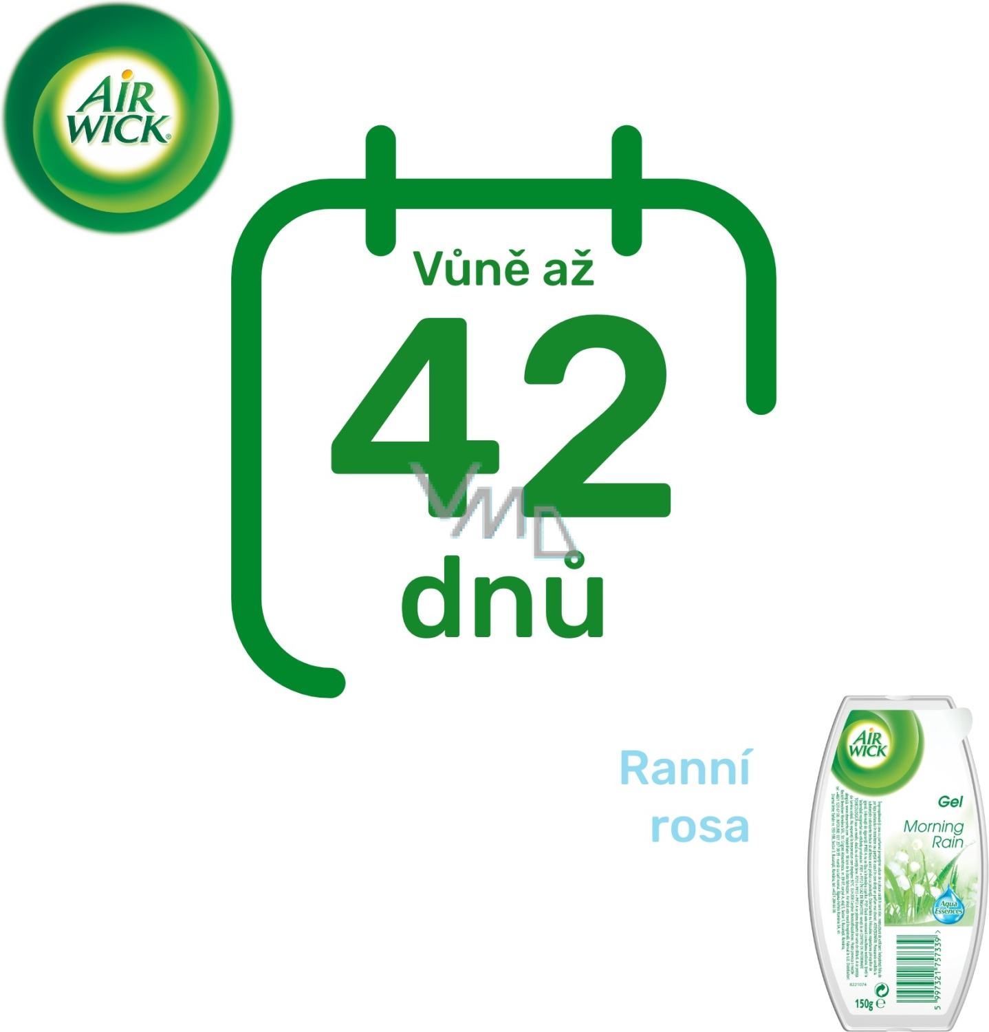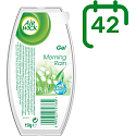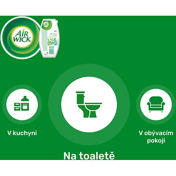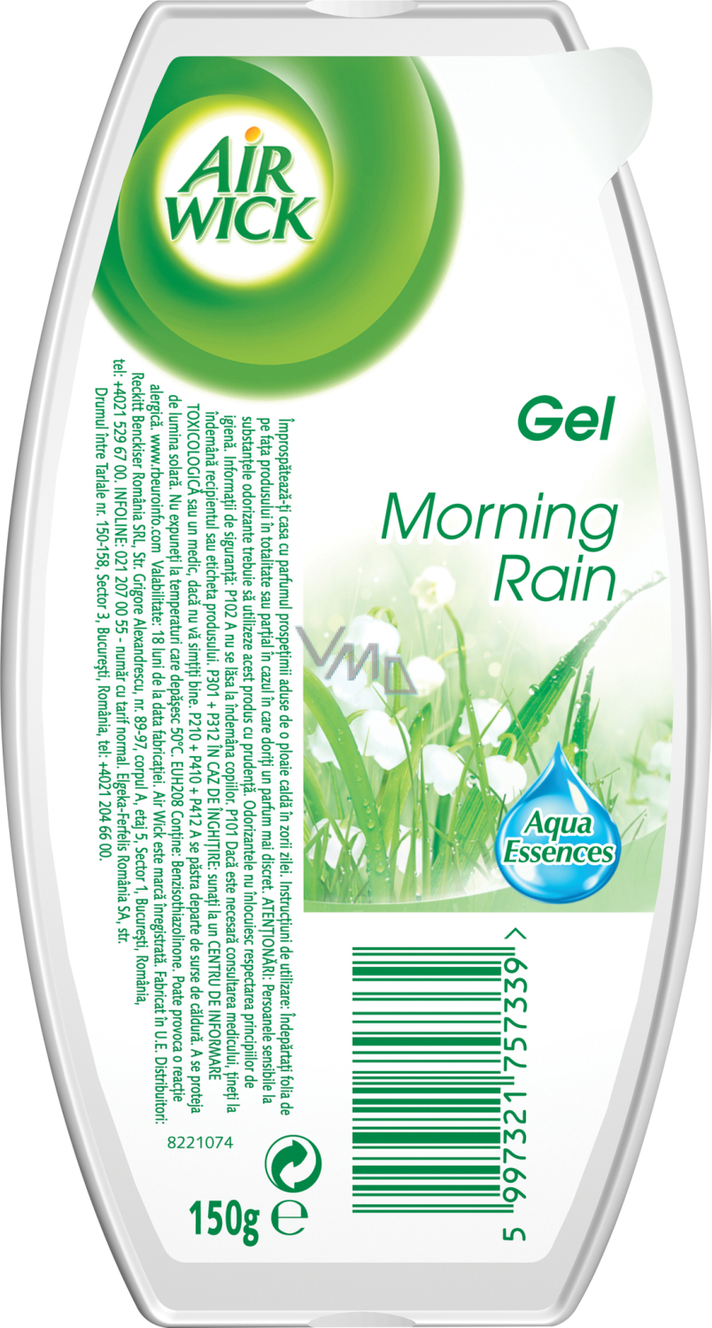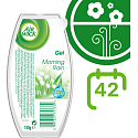 Zapachowy żel Air Wick o zapachu porannej rosy. Świeży zapach porannej rosy pomaga eliminować nieprzyjemne zapachy. Tłumi zapachy. Odświeża powietrze.