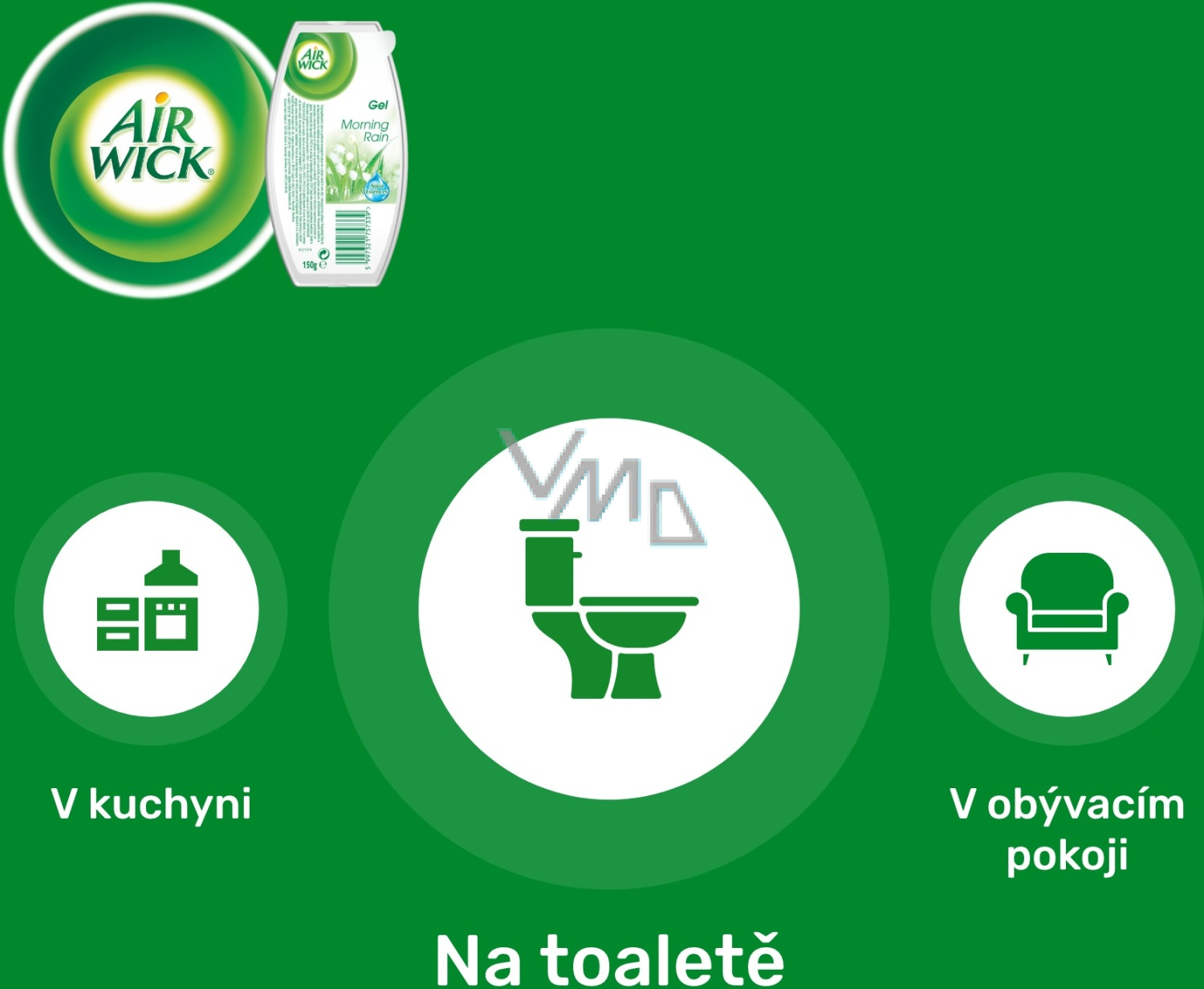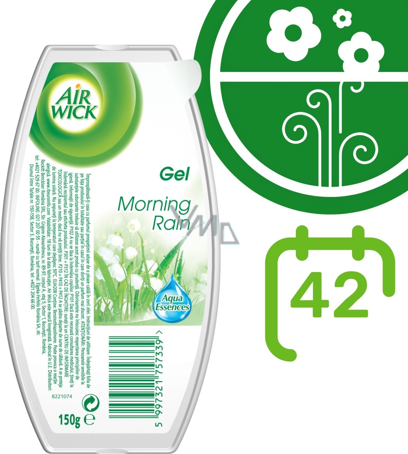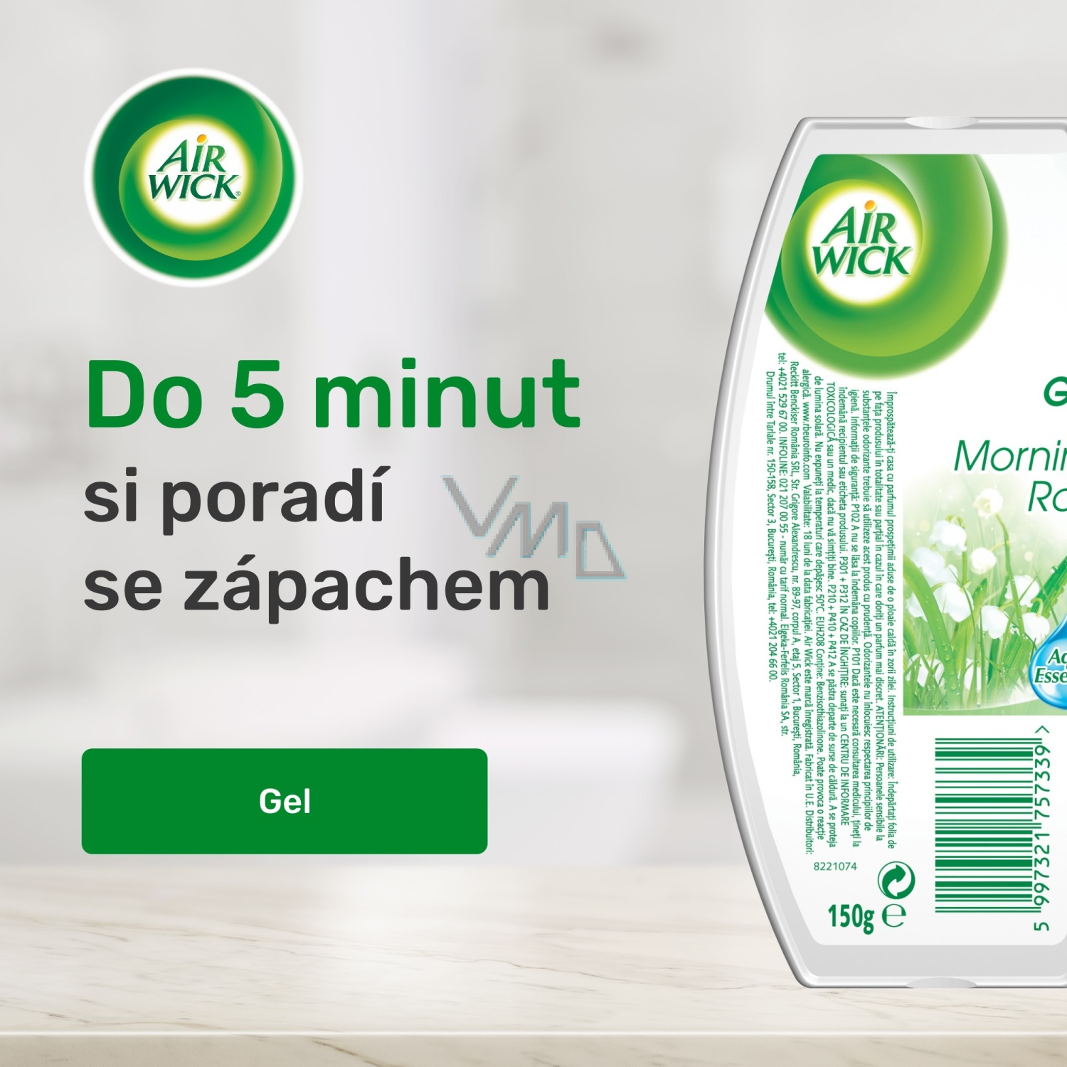 Zapachowy żel Air Wick o zapachu porannej rosy. Świeży zapach porannej rosy pomaga eliminować nieprzyjemne zapachy. Tłumi zapachy. Odświeża powietrze.