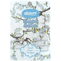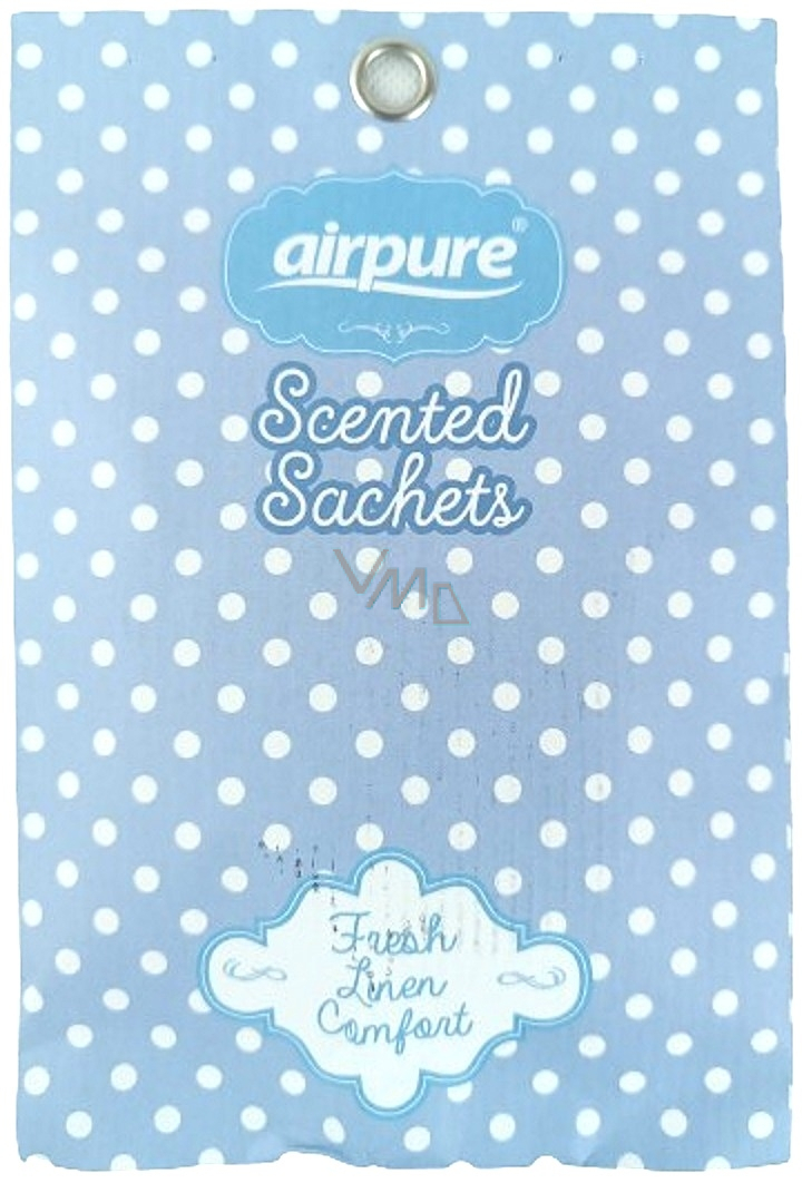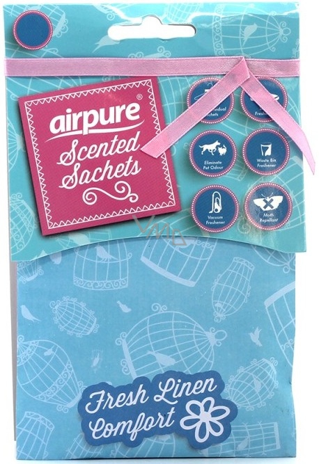 Airpure vonné sáčky jsou nejen nejsilnější ve vůni, ale jsou i nejvšestrannějším výrobkem na trhu. Aromatické oleje obsažené ve vonném sáčku se pomalu uvolňují do ovzduší a tím napomáhají k odstraňovaní nepříjemných pachů. Mohou být použity k osvěžení koupelen, odpadkových košů, zásuvek, skříní, automobilů a do vakuových pytlů. Protřepejte vonné sáčky, obsahující 100% přírodní granule, které jsou obohaceny vůní na bázi esenciálních olejů.