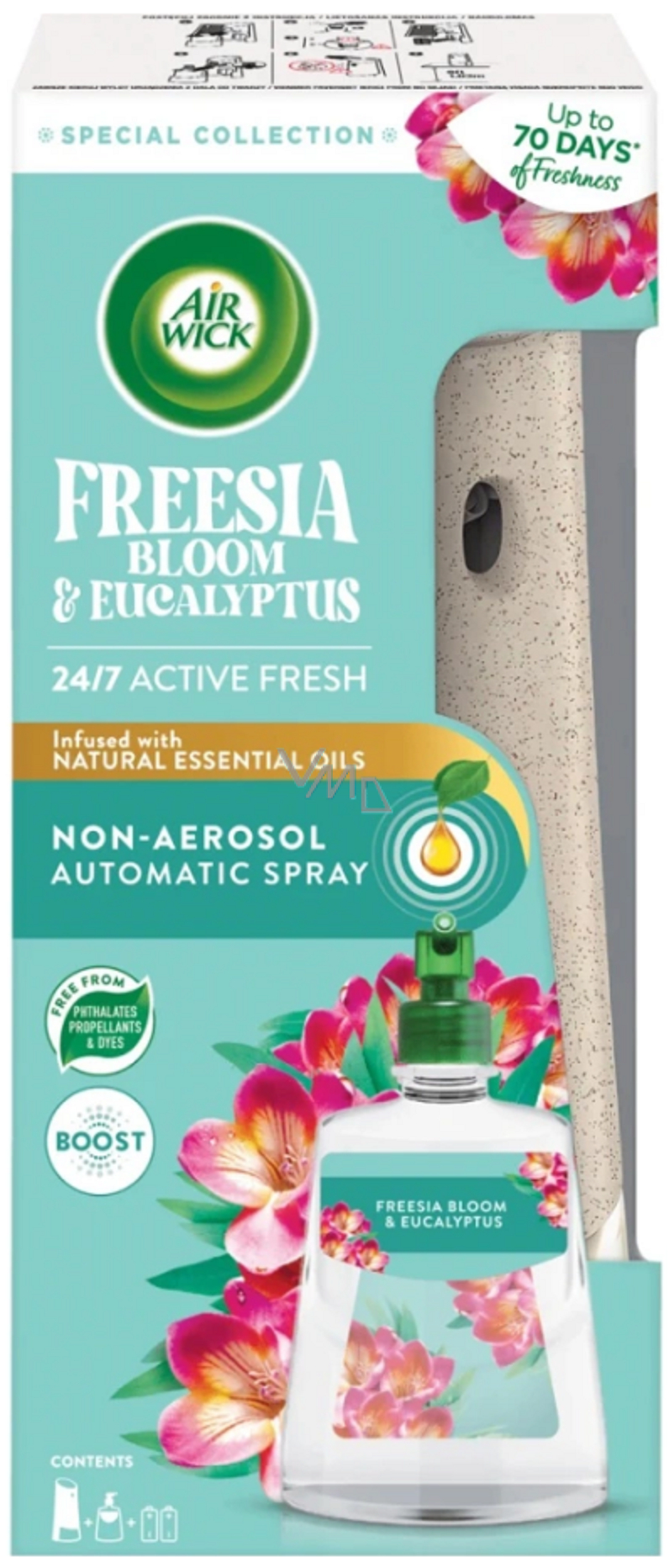 Automatyczny dyfuzor i wkład Air Wick Active Fresh na bazie wody Frezja i eukaliptus to automatyczny odświeżacz powietrza na bazie wody. Ciesz się czarującymi zapachami z naturalnymi olejkami eterycznymi. Receptura jest wzbogacona o cząsteczki neutralizujące zapachy, które skutecznie radzą sobie z nieprzyjemnymi zapachami. Skład na bazie wody jest wynikiem starannego doboru składników: bez ftalanów, propanów i barwników. Dla domu pełnego świeżych i przyjemnych zapachów.