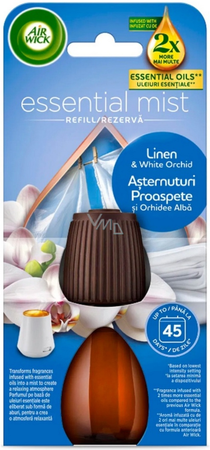 Air Wick Essential Mist Linen & White Orchid – wkład 20 ml przynosi do twojego domu delikatny zapach świeżo wypranego prania wzbogacony eleganckimi nutami białej orchidei. Dzięki technologii Essential Mist zapach naturalnie rozprasza się w delikatnej mgle, która na długo i równomiernie wypełnia przestrzeń. Idealny do świeżej, czystej i uspokajającej atmosfery przez cały dzień.