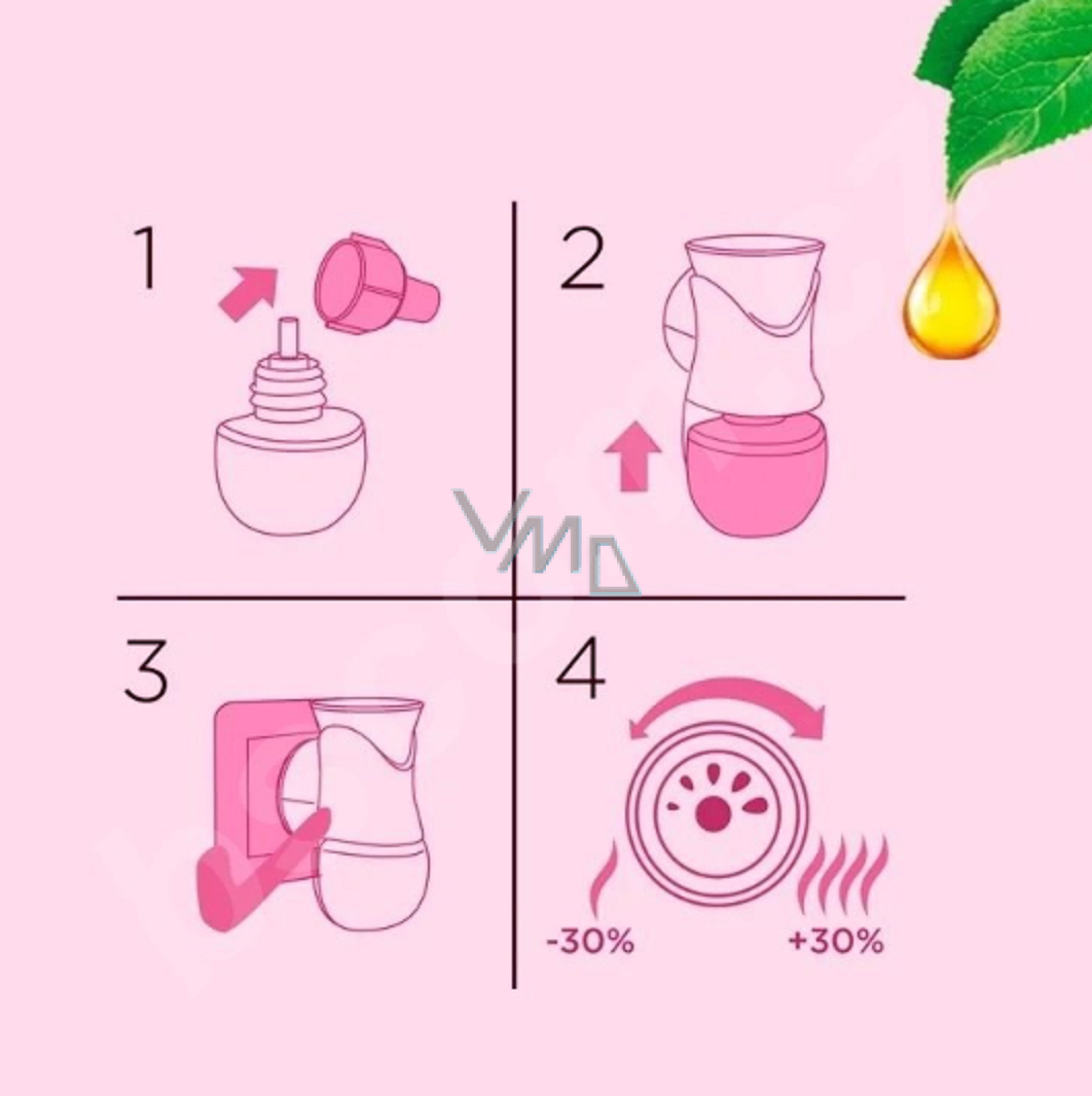 Wkład po odkręceniu zatyczki po prostu włóż do odświeżacza. Przy zakładaniu powinieneś usłyszeć kliknięcie. Następnie możesz go włożyć do gniazdka. Pokrętłem na górnej części urządzenia ustaw żądany poziom intensywności. Możesz wybierać spośród 5 intensywności dawkowania. W zależności od tego ustawienia wkład wytrzyma aż 80 dni. Oczywiście należy przechowywać buteleczkę poza zasięgiem dzieci.