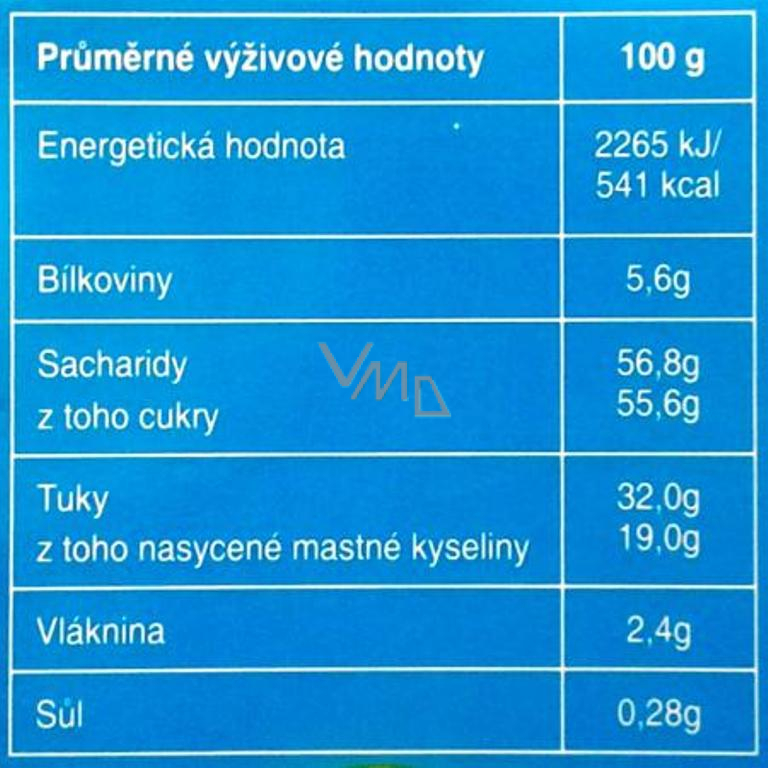 Cukr, kakaové máslo, sušené odstředěné mléko (14% hm), kakaová hmota, sušená syrovátka, emulgátor: sójový lecitin, aroma: vanilin. Obsah kakaové sušiny min 32% hmotnosti. Může obsahovat stopy arašídů, jiných skořápkových plodů a sóji.