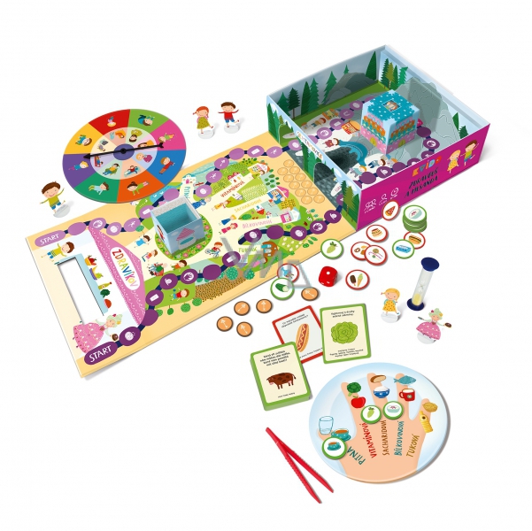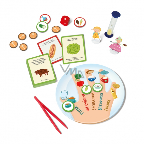 Hra Zdravouš a Mlsanda - Kvído obsahuje: herní plán, 50 karet, zdravý talíř, hrací kostku, studánku, pinzetu, hrad Mlsandy, 20 žetonů klíčů, otočnou střelku s pohybovými úkoly, 6 figurek s podstavci, 50 žetonů se surovinami a pravidla.