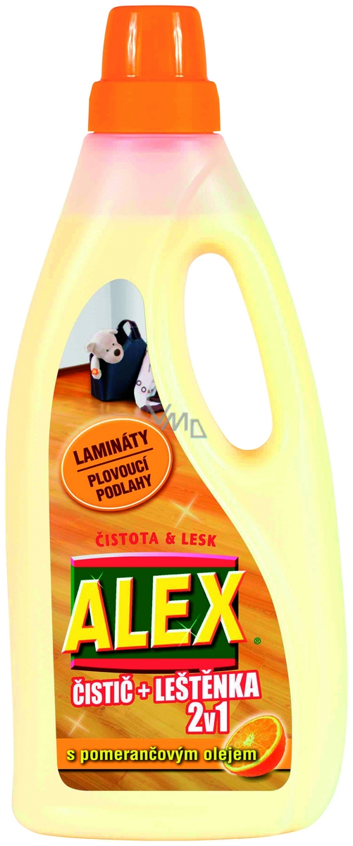 Alex 2 v 1 s pomerančovým olejem velmi účinně čistí všechny druhy plovoucích laminátových, korkových i dřevěných podlah a zároveň jim dodává lesk, který se snadno a pohodlně při každém použití obnovuje. Obsahuje protiskluzové složky, rychle schne a nezenechává stopy.