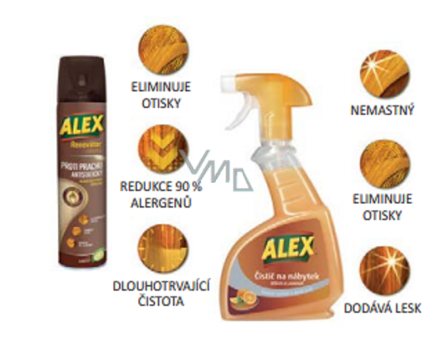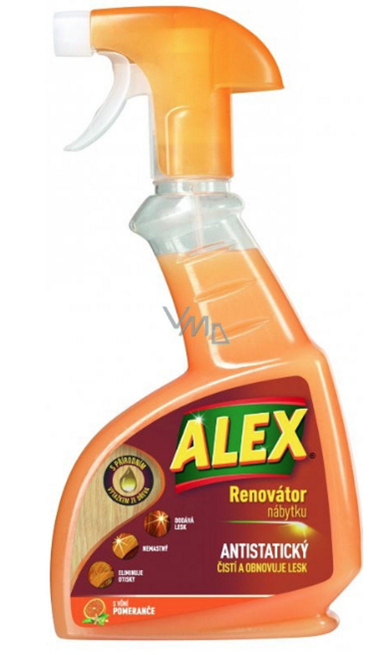 ALEX sprej čistič na nábytek s výtažky z pomeranče velice rychle a pohodlně čistí, ošetřuje a chrání nábytek ze dřeva i laminátu. Jeho výjimečné složení s výtažky z pomeranče nábytek vyživuje, zabraňuje stárnutí a dodává při každé aplikaci trvalý lesk. Nedoporučuje se na nemořené nebo nevoskované plochy.