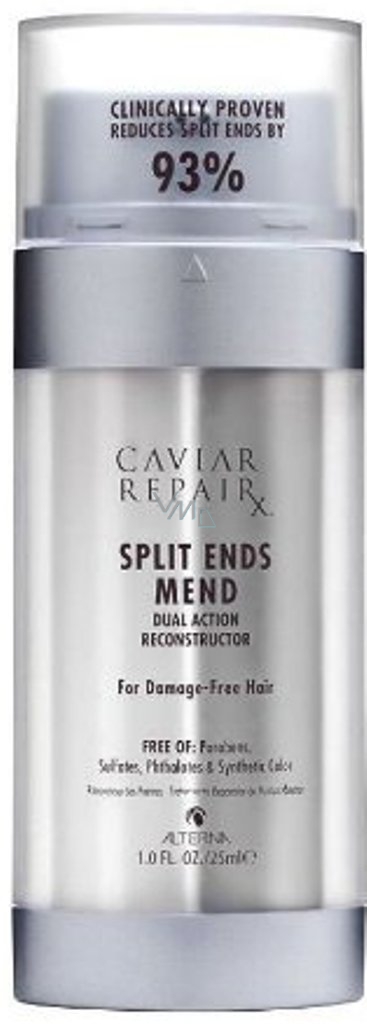 Alterna - Caviar RepaiRx Split Ends Mend obsahuje účinné proteiny, které umí vyplnit trhlinky ve vlasech a unikátním způsobem tak obnovují vlasová vlákna. Receptura díky obsaženému komplexu s účinkem proti stárnutí Caviar Age-Control Complex® a komplexu pro stálost barvy Color Hold® velmi úspěšně bojuje se škodlivými vlivy, působí proti všem druhům stárnutí vlasů a zabraňuje blednutí a vymývání barvy z vlasů.