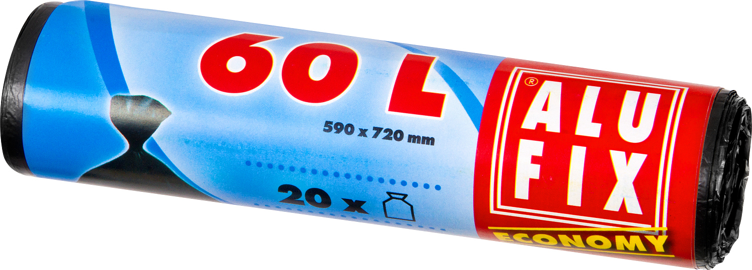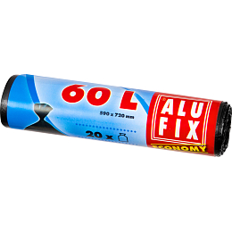 Czarne praktyczne worki Alufix na śmieci, mocne 13 µ (mikronów), rozmiar worka 59 × 72 cm, pojemność worka 60 l, opakowanie 20 sztuk. Wykonane z polietylenu o wysokiej gęstości (HDPE).