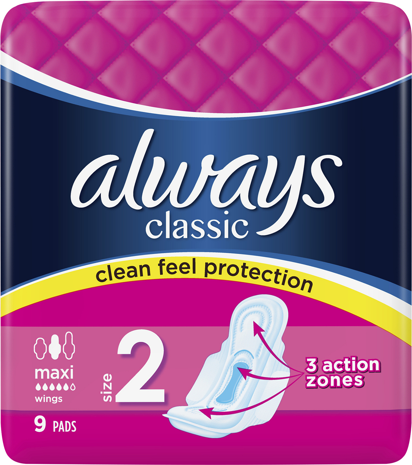 Always Classic Maxi wkładki higieniczne zapewniają bezpieczną i dyskretną ochronę przez cały cykl menstruacyjny. Rdzeń absorpcyjny zawiera specjalny materiał, który szybko absorbuje i zatrzymuje płyn wewnątrz wkładki w ilości wielokrotnie przekraczającej jego wagę.