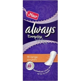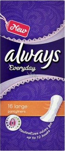 Dopřejte si pohodlí a svěžest se slipovými vložkami Everyday Large oblíbené značky Always. Spolehlivě udrží pach až po dobu 12 hodin. Jsou velmi tenké a jejich vrchní strana je heboučká. Dopřejte si jen to nejlepší!