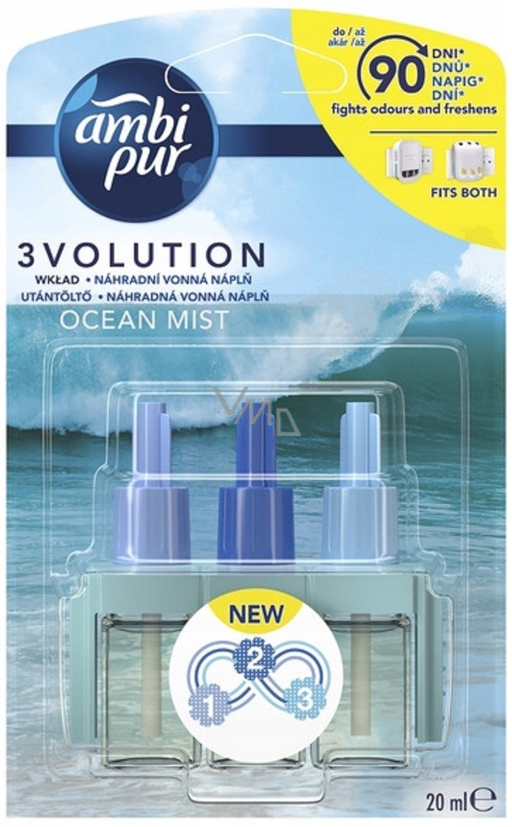 Zapasowy wkład Ambi Pur 3volution Ocean Mist skutecznie neutralizuje nieprzyjemne zapachy. Nieustannie usuwa zapachy i roztacza 3 wzajemnie uzupełniające się aromaty, dzięki czemu zapewnia niezrównaną świeżość. Odkryj piękno olśniewającego zapachu, który pobudzi Twoje zmysły. Ocean Mist wypełni Twój dom eleganckim aromatem. Co 45 minut automatycznie roztacza nowy zapach. Intensywność odświeżania możesz regulować samodzielnie.