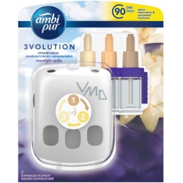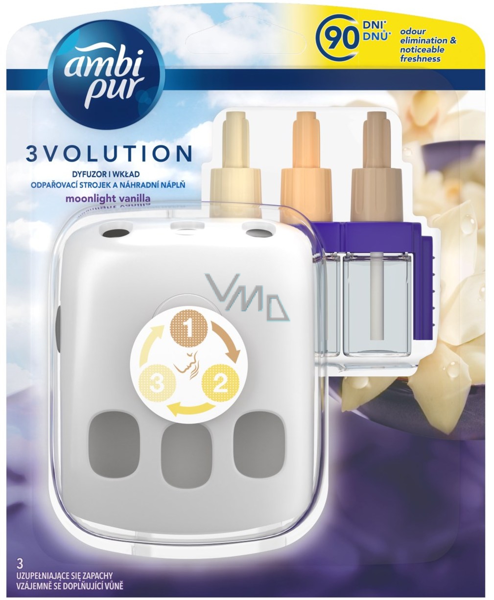 Elektrické osvěžovače vzduchu vytvářejí příjemnou vůni a atmosféru domova nebo kanceláře. Na vůni si však během krátké doby zvykneme a přestaneme ji vnímat. Ambi Pur 3volution používá 3 různé parfémy harmonicky se prolínající jeden v druhý. Vůně se samostatně spínají každých 45 minut. Na strojku si můžete nastavit intenzitu vůně a diody, které se postupně rozsvítí, indikuje která z vůní je právě aktivní. Ambi Pur 3Volution, první osvěžovač vzduchu, který si budete užívat znovu a znovu a znovu. Vydrží 90 dní při 12-ti hodinovém denním používáním a minimální intenzitě vůně.