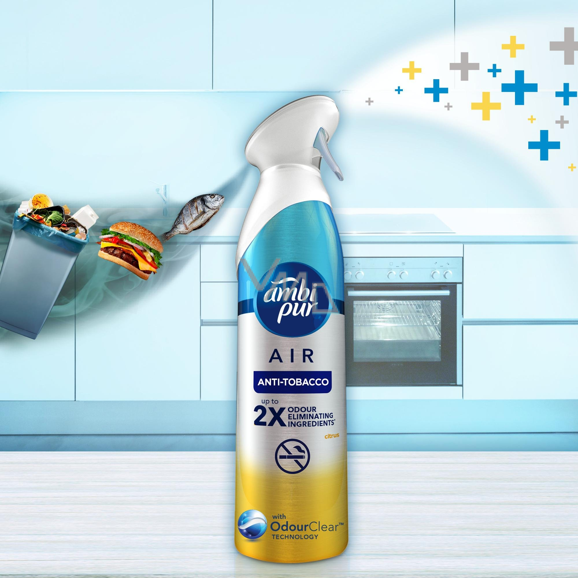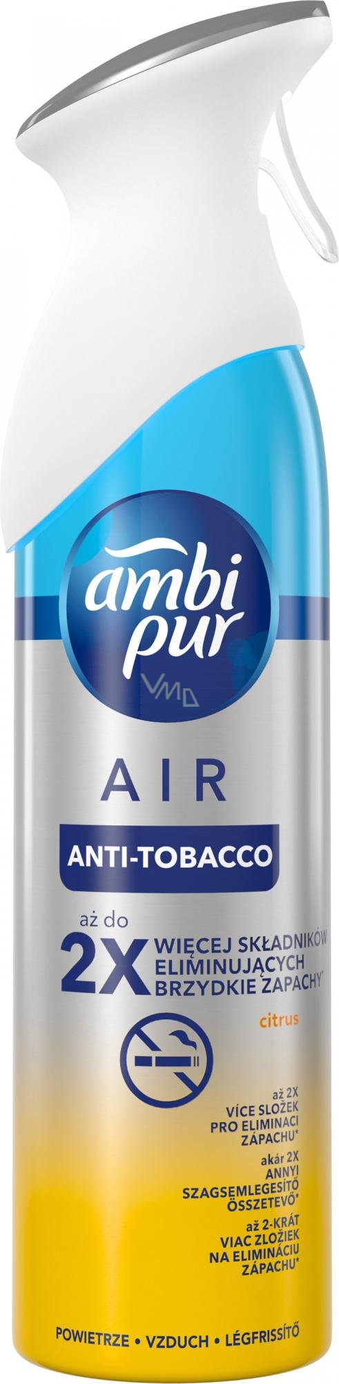 Nevíte, jak si poradit s nepříjemným a vytrvalým tabákovým pachem? My ano. S osvěžovačem vzduchu Ambi Pur Anti Tobacco odstraníte stopy po cigaretovém kouři snadno a rychle v celé domácnosti a nahradíte ho lehkou svěží citrusovou vůní. Díky unikátní technologii OdourClear je sprej účinnější než všechny předchozí generace těchto přípravků.