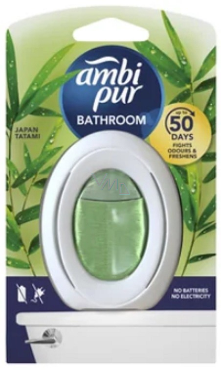 Ambi Pur Bathroom Japan Tatami przyniesie do twojej łazienki przyjemny zapach. Odświeżacz usuwa z powietrza nieprzyjemne zapachy i jednocześnie zapobiega ich osadzaniu na miękkich powierzchniach, takich jak ręczniki, wanny czy zasłony prysznicowe. Dzięki unikalnej technologii Odour Clear zapewni ciągły zapach przez okres 45 dni. Odświeżacz powietrza jest żelowy, dzięki czemu działa bez potrzeby użycia baterii czy energii elektrycznej. Spraw, aby twoja łazienka była wyjątkowa dzięki Ambi Pur Bathroom.