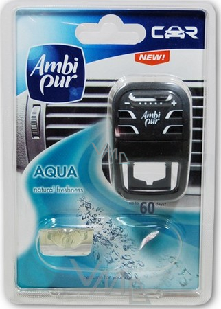 Ambi Pur Car je tekutým osvěžovačem vzduchu do vozu, který díky obsahu skutečného parfému příjemně provoní interiér vašeho vozu. Stálá intenzivní vůně po dobu 70 dní. Nejžádanější osvěžovač vzduchu v České republice. Kupte svému miláčkovi kvalitní parfém a vyberte si vůni, která se bude líbit vašemu vozu! Náplně jsou vhodné do všech typů mono strojků Ambi Pur. Ambi Pur Car Aqua decentní vůně přírodní svěžesti. Elegantně provoní interiér vozu a eliminuje zápach.