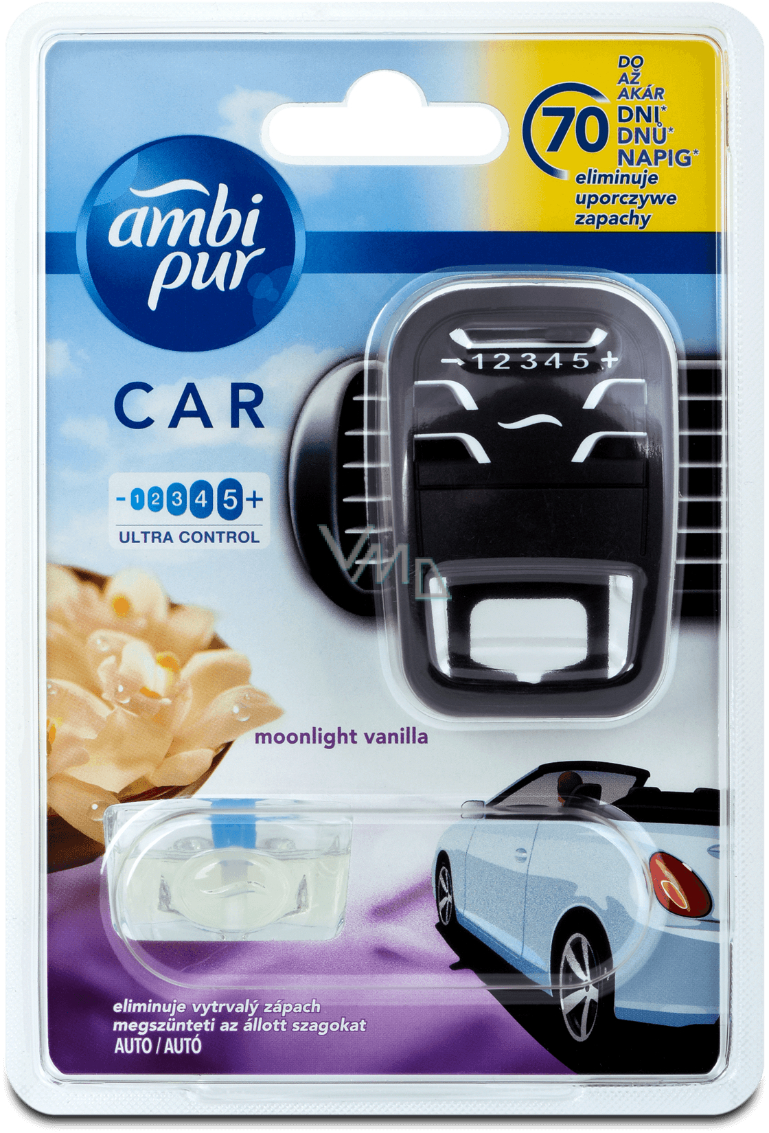 Ambi Pur Car Moonlight Vanilla decentní vůně vanilky je tekutým osvěžovačem vzduchu do vozu, který díky obsahu skutečného parfému příjemně provoní interiér vašeho vozu. Díky obsahu skutečného parfému příjemně provoní interiér vašeho vozu na dlouho dobu. Lze nastavit ideální intenzitu působení vůně a nepříjemné zápachy promění v naprostou svěžest během okamžiku.