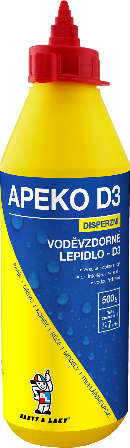 APEKO D3 to uniwersalny klej rozpuszczalny wodą do drewna tworzący wysokiej wytrzymałości elastyczne połączenia. Przeznaczony do klejenia mebli drewnianych (również do użytku zewnętrznego), podłóg pływających ze połączeniem wpust-wypust, parkietów oraz twardego drewna z litego drewna i gatunków egzotycznych. Bardzo odpowiedni do produkcji zewnętrznych okien i drzwi z wodoodpornością zgodnie z klasyfikacją klasy odporności D3 (do użytku zewnętrznego bez stałego kontaktu z wodą). Powierzchnie i połączenia klejone klejem APEKO D3 nie stępiają ostrzy maszyn skrawających używanych w przemyśle drzewnym i meblarskim.