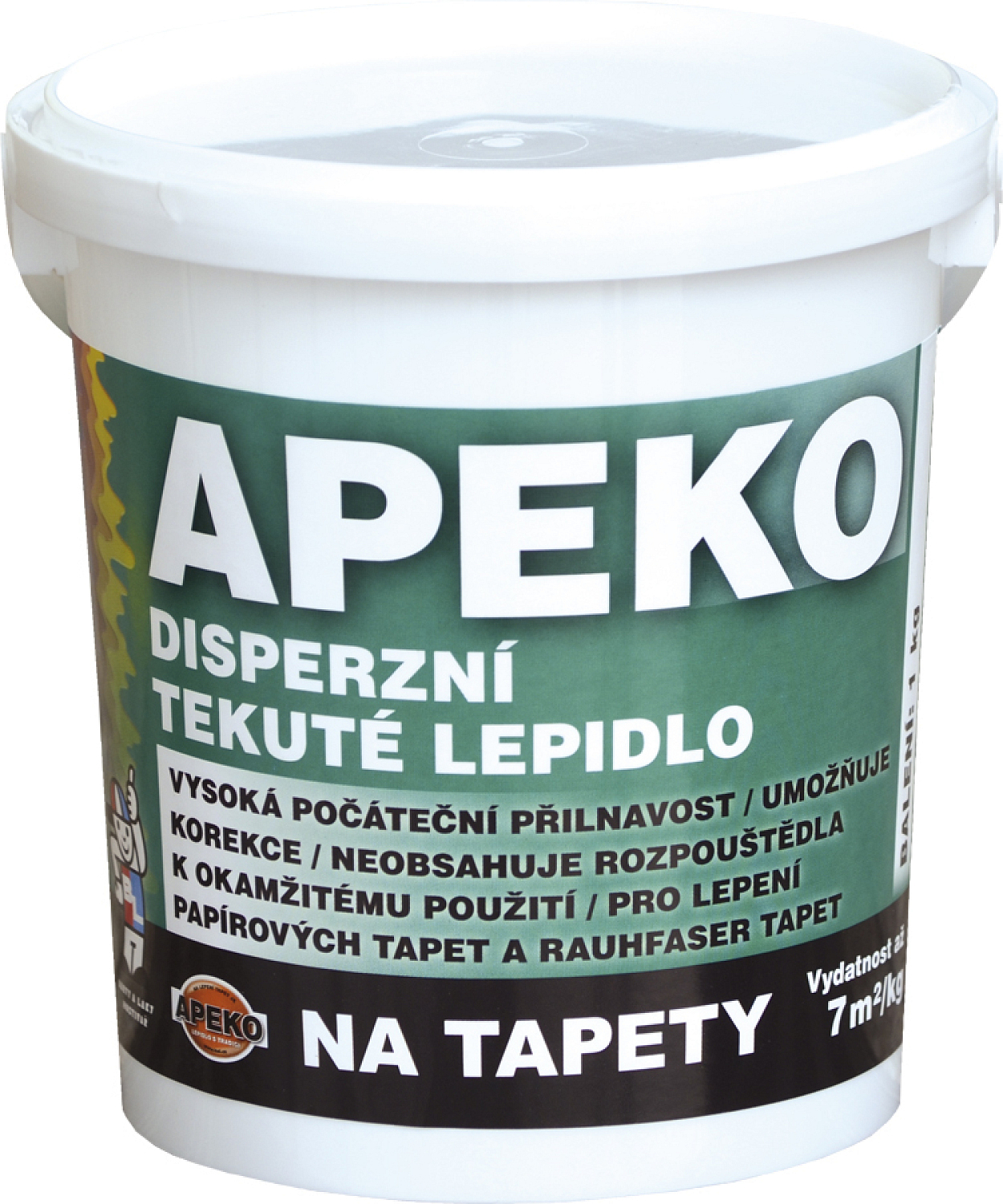 Apeko V1306 klej na běžné tapety k lepení různých druhů tapet v interiérech na dřevo, kov, beton, omítky, dřevěné materiály a podobné. Tapetový klej Apeko lze dále využít jako tekuté klížidlo pro malířské přípravky. Disperzní tekutý klej na tapety je vhodný na papírové tapety, tapety PVC s papírovou podložkou, tapety reflexní a dekorační papíry.