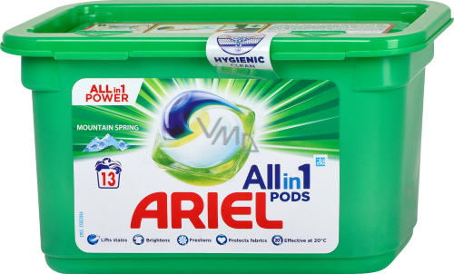 Ariel prací kapsle Mountain Spring poskytují výjimečné čisticí účinky v jedné malé kapsli. Kapsle na praní prádla Mountain Spring mají unikátní vícekomorový design, který udrží složky stabilně oddělené do doby, než se namočí, což zaručuje super koncentrované čisticí účinky. Inovační obal kapslí na praní od značky Ariel se zcela rozpouští v kontaktu s vodou a uvolňuje účinné látky. Ariel prací kapsle Mountain Spring si poradí s celou škálou různých skvrn.