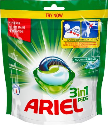 - gelové kapsle na praní Ariel Mountain Spring odstraňují skvrny a rozjasňují