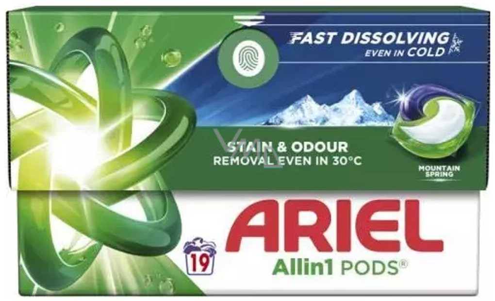 Objevte sílu Ariel All in 1 PODS Mountain Spring – prací kapsle, které kombinují vše potřebné pro perfektní praní v jedné dávce. Jejich vícekomorový design uchovává účinné složky odděleně až do začátku pracího cyklu. Jakmile kapsle přijde do kontaktu s vodou, její filmová vrstva se rychle rozpustí a aktivuje intenzivní recepturu, která zajišťuje hloubkovou čistotu a svěžest i při praní na nízké teploty od 30 °C.