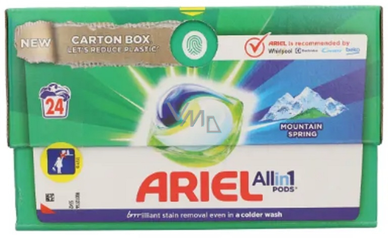 Kapsułki żelowe Ariel All in1 Pods zostały zaprojektowane z myślą o specjalnie opracowanych technologiach, takich jak np. Cool Clean. Dzięki kartonowemu opakowaniu ECOCLIC, które można poddać recyklingowi, kapsułki do prania Ariel pomagają zmniejszyć ilość plastiku. Zawierają maksymalnie 5% plastiku i zostały zaprojektowane tak, aby bezpiecznie przechowywać kapsułki. Po kontakcie z wodą opakowanie kapsułek w 100% rozpuszcza się i uwalnia skuteczne substancje, które usuwają plamy. Kapsułki All-in-1 Pods Mountain Spring praniają najdokładniej i najskuteczniej.