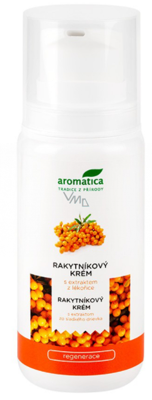 Jemný, lehce vstřebatelný krém s obsahem vysoce kvalitního oleje z rakytníku řešetlákového, extraktem z lékořice a vitaminem E vhodný pro každodenní péči. Regeneruje, zjemňuje a chrání normální, suchou, namáhanou a podrážděnou kůži obličeje, rukou i celého těla. Rakytníkový krém prošel téměř tříletým vývojem, aby byl velmi účinný pro citlivou, ekzematickou, velmi suchou a sluncem podrážděnou pleť. Vysoký obsah rakytníkového oleje v krému dodává pleti světle broskvový odstín.