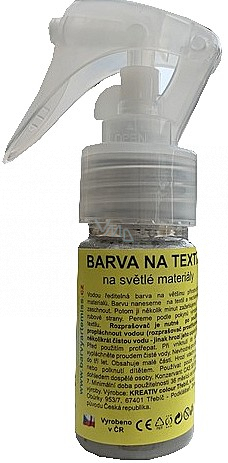 Vodou ředitelná barva na většinu přírodních textilních světlých materiálů. Barvy ve spreji můžeme použít k dekorování textilu přes šablony či samostatně nebo vytvářet batikovací vzor. Barva se vyrábí v konzistenci, která umožňuje přímo kreslit na většinu textilních materiál. Pokud by se vám barva zdála příliš hustá je ji možné opatrné naředit vodou, nebo ředidlem Art e Miss. Čím je barva řidší, tím více se propíjí skrz látku. Barevné odstíny jsou mezi sebou vzájemně mísitelné.