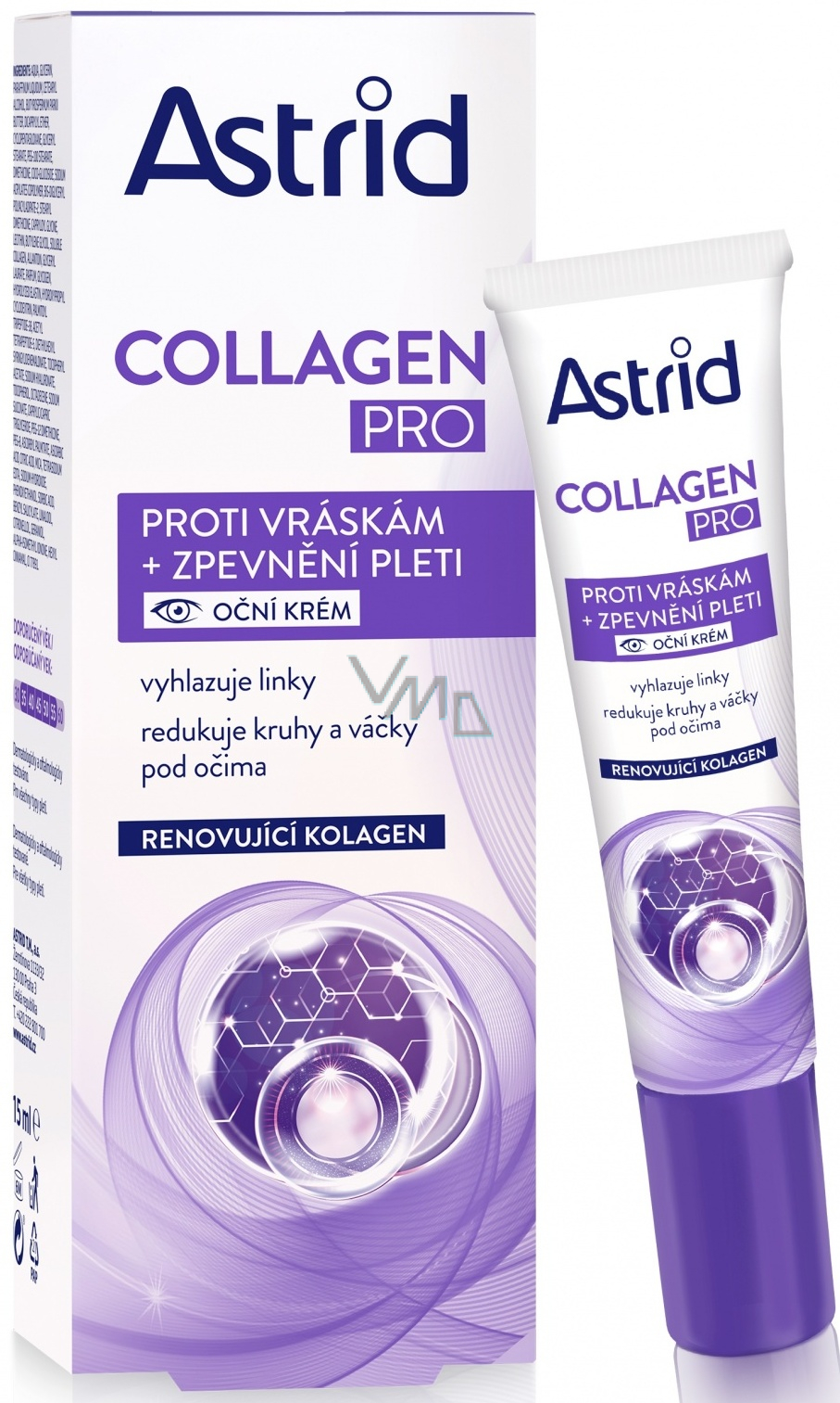 Oční krém proti vráskám ASTRID Collagen Pro o objemu 15 ml využívá inovativní technologii, která pomáhá vrátit pleti mladistvý vzhled. Díky renovujícímu kolagenu stimuluje tvorbu tří typů přirozeného kolagenu a pomáhá tak vyhladit vrásky a jemné linky. Viditelně působí proti projevům stárnutí pleti a navrací jí plnost. Zároveň udržuje optimální úroveň hydratace v pokožce, účinně pomáhá redukovat tmavé kruhy a váčky pod očima a zanechává pleť jemnou a svěží. Krém je určen pro jemnou a citlivou pokožku kolem očí. Již po jednom týdnu působí oční okolí více odpočatě a po jediném měsíci je pleť viditelně pevnější a vrásky redukované.