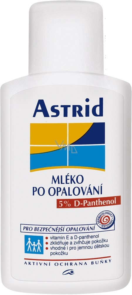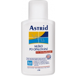 Astrid mléko po opalování s 5% D-panthenolu je jemná, lehce roztíratelná emulze. Zmírňuje nepříjemné následky nadměrného opalování. Snižuje citlivost a napětí pokožky. Dodává pleti potřebnou vlhkost. Obsažený vitamin E a D-panthenol omezují vliv volných radikálů, aktivně podporují ochranu buňky a dále podporují přirozenou regeneraci pleti a její zdravý vzhled. Svým složením je vhodná i pro jemnou dětskou pokožku.