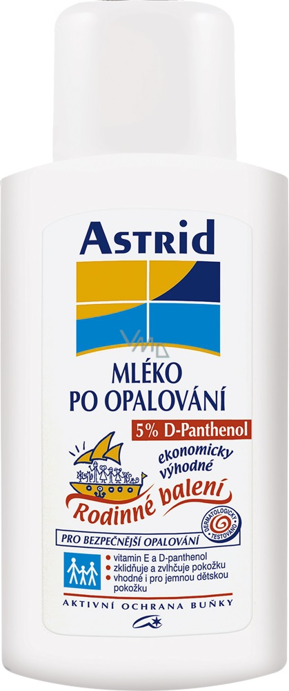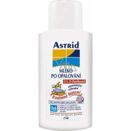 Astrid mléko po opalování s 5% D-panthenolu ""rodinné balení"" je jemná, lehce roztíratelná emulze. Zmírňuje nepříjemné následky nadměrného opalování. Snižuje citlivost a napětí pokožky. Dodává pleti potřebnou vlhkost. Obsažený vitamin E a D-panthenol omezují vliv volných radikálů, aktivně podporují ochranu buňky a dále podporují přirozenou regeneraci pleti a její zdravý vzhled. Svým složením je vhodná i pro jemnou dětskou pokožku.
