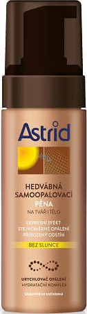 Astrid Sun hedvábná samoopalovací pěna na tvář i tělo dodá pokožce již po první aplikaci přirozenou zlatavě-bronzovou barvu bez účinků slunečního záření. Lehké složení s urychlovačem opálení se okamžitě vstřebává a zajišťuje stejnoměrné, rychlejší a intenzivnější opálení pokožky. Obsažený hydratační komplex napomáhá prodloužit efekt opálení. Pěnová textura zajišťuje snadnou a rychlou aplikaci a zanechává pokožku hedvábně jemnou.