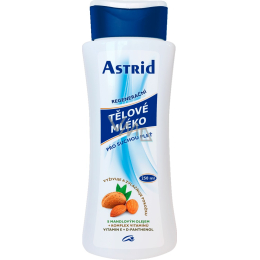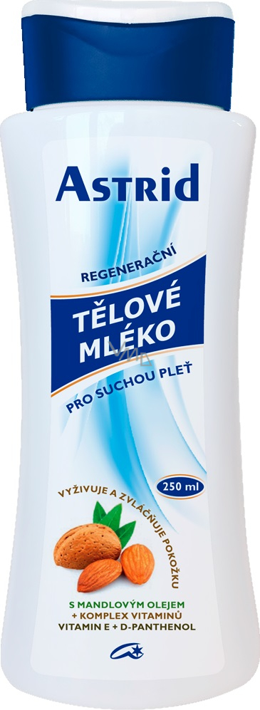 Astrid regenerační tělové mléko pro suchou pleť. Jemná krémová emulze speciálně vyvinutá pro každodenní intenzivní péči o suchou pleť. Mandlový olej se dobře vstřebává, zjemňuje a zvláčňuje pokožku a zabraňuje jejímu vysoušení. Obsažené plnohodnotné látky - vitamin E, D-panthenol a allantoin udržují pokožku pružnou a svěží a napomáhají její regeneraci a zklidnění. Dodává pleti potřebnou vlhkost. Snadno se roztírá a vstřebává. S novou vůní vyhovující nejnovějším požadavkům alergologů.