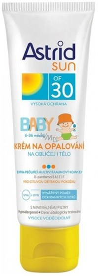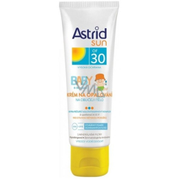 Astrid Sun Dětský krém na opalování OF 30 s inovativní sluneční technologií (UVA/UVB/IR*/VL*) *Test in vitro poskytuje pokožce širokospektrální fotostabilní ochranu před škodlivými vlivy UV a infračerveného záření a viditelného světla. Krém obohacený o provitamin D a β-glukan efektivně chrání citlivou dětskou pokožku a napomáhá udržení hydratace v pokožce. Lehké, snadno vstřebatelné složení bylo vyvinuto tak, aby se minimalizovalo riziko alergických reakcí.