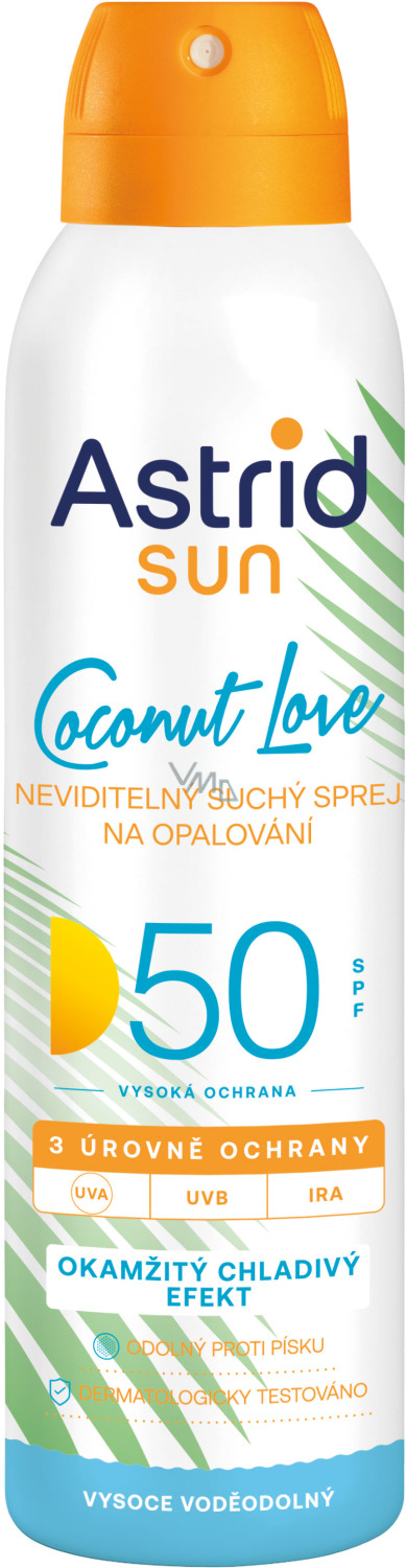Astrid Sun Neviditelný suchý sprej na opalování OF 50 s inovativní sluneční technologií (UVA/UVB/IR*/VL* Test in vitro na IRA a HEVL) poskytuje pokožce širokospektrální fotostabilní ochranu před škodlivými vlivy UV a infračerveného záření a viditelného světla.