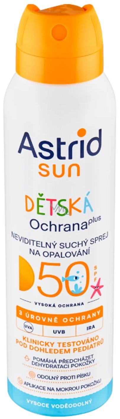 Astrid Sun dla dzieci to niewidoczny suchy spray do opalania z ochroną OF50 i jest odpowiedni dla dzieci od 3 roku życia. Uwzględnia specjalne potrzeby dermatologiczne dzieci i zapewnia optymalną ochronę przed 3 głównymi rodzajami promieniowania słonecznego (UVA, UVB, IRA), które uszkadzają skórę. Także pomaga zminimalizować ryzyko reakcji alergicznych i dzięki rewolucyjnej technologii umożliwia aplikację na mokrą i suchą skórę. Wysoce wodoodporny spray z 360° mechanizmem rozpylającym jest odporny na piasek i nie pozostawia białego filmu na skórze. Dodatkowo pomaga zapobiegać odwodnieniu skóry. Dziecięcy spray do opalania od marki Astrid uprzyjemnia dni spędzone na słońcu.