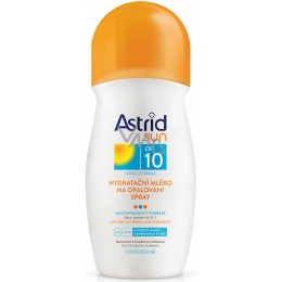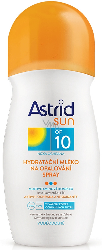 Astrid Sun Hydratační mléko na opalování ve spreji OF 10 obsahuje systém fotostabilních UV filtrů, který spolehlivě chrání pokožku před škodlivými vlivy UVA a UVB záření. Složení obohacené o multivitaminový komplex (beta-karoten, vitaminy A, E, F) poskytuje aktivní antioxidační ochranu, chrání pokožku před předčasným stárnutím a napomáhá bezpečnějšímu opalování. Mléko obsahuje D-panthenol, podporuje hydrataci pokožky a chrání ji před ztrátou vlhkosti a pružnosti.