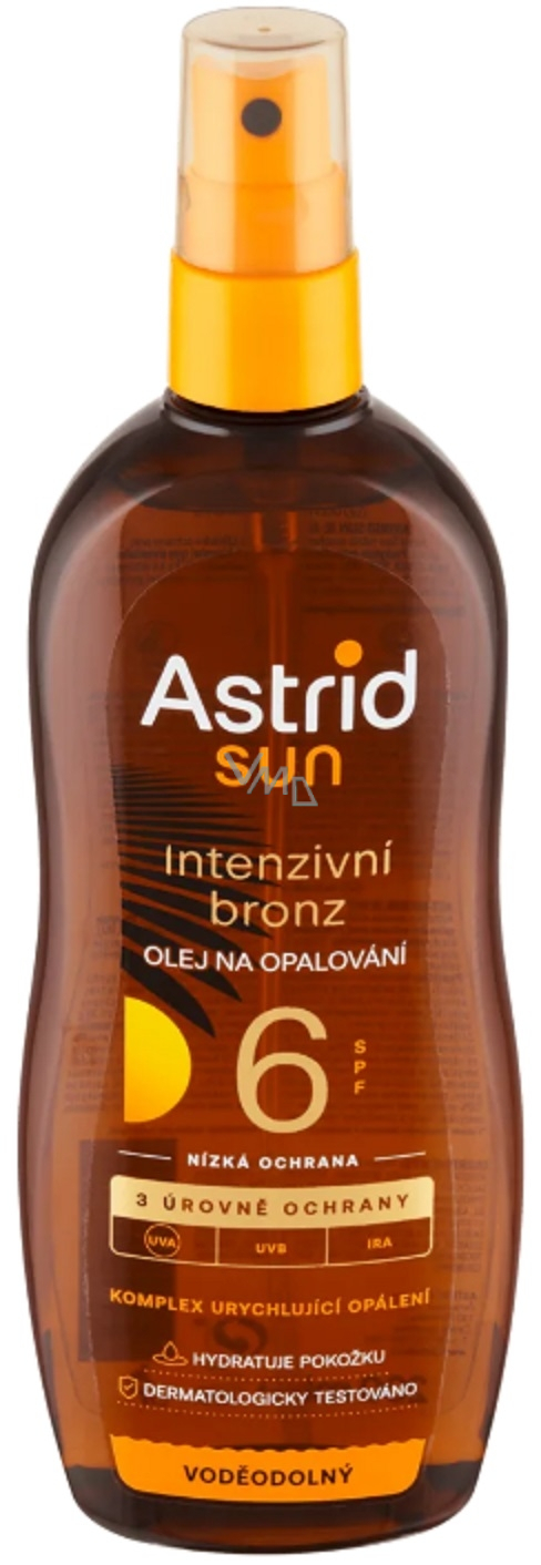 Astrid Sun olej do opalania oferuje znacznie więcej niż tylko podstawową ochronę przed słońcem. Zapewnia optymalną ochronę przed 3 głównymi typami promieniowania słonecznego (UVA, UVB, IRA), które uszkadzają skórę. Dzięki kombinacji naturalnych olejów dodatkowo wspiera intensywniejsze opalanie skóry i utrzymanie jej brązowego wyglądu. Wodoodporny olej do opalania z witaminą E również nawilża skórę.