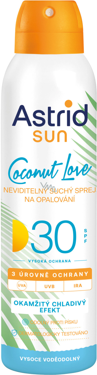 ASTRID SUN Niewidoczny suchy spray do opalania COCONUT LOVE OF 30 z innowacyjną technologią słoneczną (UVA/UVB/IR/VL) zapewnia skórze szerszą fotostabilną ochronę przed szkodliwymi wpływami UV oraz promieniowaniem podczerwonym i światłem widzialnym.