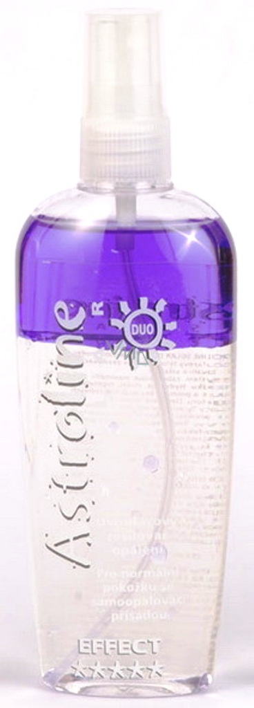 Astroline Solar Duo - univerzální moderní dvoufázový tělový sprej se zesilovačem k opalování v soláriích. Duo system zabezpečuje maximální péči o pokožku. Hydratuje, chrání, regeneruje, vyživuje a promastí bez použití dráždivých emulgátorů. Elegantně, moderně. Deriváty Tyrosinu se vstřebají a vlivem UV záření přemění v pokožce na tělu vlastní kožní barvivo. Tím je opálení výrazně zesíleno a zefektivněno.
