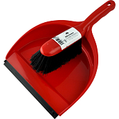 Plastowy zestaw zmiotki zawiera plastikową szufelkę z gumową listwą oraz formowaną rączkę i zmiotkę z czarnym włosiem.